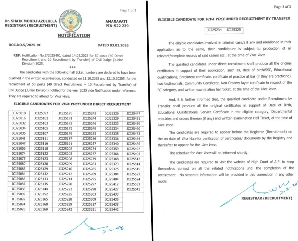 ఆంధ్రప్రదేశ్ హైకోర్టులో సివిల్ జడ్జి పోస్టుల భర్తీ ప్రక్రియ తుది అంకానికి చేరుకుంది. గతేడాది నిర్వహించిన రాత పరీక్షలో ప్రతిభ చాటిన అభ్యర్థుల జాబితాను రిజిస్ట్రార్ మంగళవారం విడుదల చేశారు. న్యాయ వ్యవస్థలో కీలకమైన జూనియర్ డివిజన్ జడ్జి పోస్టుల కోసం జరిగిన ఈ పోటీలో విజేతలుగా నిలిచిన వారు ఇక ఇంటర్వ్యూ ఎదుర్కోవాల్సి ఉంటుంది.
