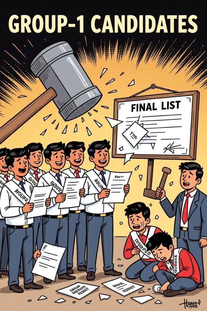 మూడున్నరేళ్ల నిరీక్షణ… నిద్రాహారాలు లేని కఠోర శ్రమ… అసంఖ్యాకమైన ఆశల పతాక. వీటన్నింటికీ ప్రతిఫలంగా తుది జాబితాలో తమ పేర్లు చూసుకుని మురిసిపోయారు గ్రూప్-1 అభ్యర్థులు. నియామక పత్రాలు అందుకోవడానికి సిద్ధంగా ఉన్న సమయంలో హైకోర్టు ఇచ్చిన తీర్పు వారి ఆశలపై పిడుగుపాటులా పడింది. తుది జాబితాను రద్దు చేస్తూ మెయిన్స్ పేపర్లను తిరిగి మూల్యాంకనం చేయాలని ఆదేశించడం... లేదంటే మళ్ళీ పరీక్షలు పెట్టాలని సూచించడం… ఈ తీర్పుతో వారి గుండె ఝల్లుమంది. ఈ ఆందోళనలో కన్నీటిలో వారి భవిష్యత్తు ప్రశ్నార్థకంగా మారింది.